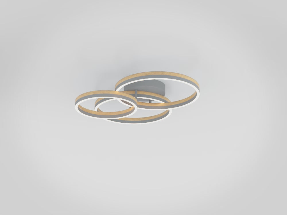 Plafoniera EGLO Cadinaro 39895 este o soluție de iluminat modernă și elegantă, ideală pentru living, dormitor sau hol. Designul său distinctiv include trei inele luminoase de dimensiuni diferite, realizate din furnir de stejar cu aspect de beton, montate pe o bază rotundă din metal de aceeași culoare.